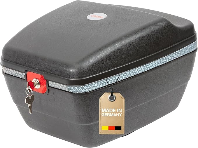Kompatybilny z wszystkimi bagażnikami. Metalowe części zabezpieczone przed korozją. Tworzywo przypominające skórę – odporne na zarysowania i łatwe w czyszczeniu. Mieści przedmioty osobiste, małe zakupy, kask i kurtkę.