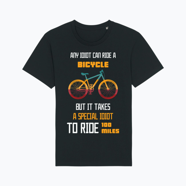 Nie każda jazda na rowerze jest taka sama. Ta koszulka z przymrużeniem oka oddaje prawdę znaną wszystkim, którzy mają za sobą długie dystanse: wsiąść na rower potrafi każdy, ale przejechać naprawdę daleko – to już inna historia. Hasło Any idiot can ride a bicycle, but it takes a special idiot to ride 100 miles łączy humor z szacunkiem dla wytrwałości i charakteru.