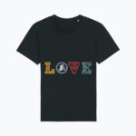 Kolorowe, zróżnicowane faktury liter tworzą nowoczesną, designerską kompozycję, która świetnie wyróżnia się na czarnym tle. To koszulka subtelna, ale znacząca – idealna dla tych, którzy wolą wyrażać siebie obrazem, a nie hasłem.