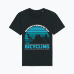 Czasem jedno zdanie mówi więcej niż długi manifest. Melancholia i jazda na rowerze po prostu do siebie nie pasują – i ta koszulka idealnie to pokazuje. Dynamiczna grafika rowerzysty na tle gór i zachodzącego słońca w turkusowej, kontrastowej stylistyce przyciąga wzrok i jednoznacznie komunikuje: rower to najlepsza terapia.