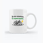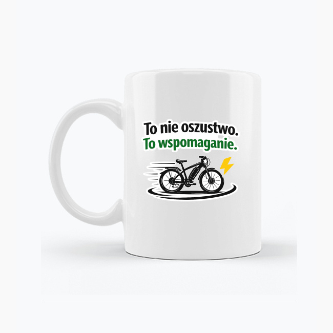 Kubek z humorystycznym nadrukiem dla miłośników rowerów elektrycznych. Grafika przedstawiająca e-bike oraz hasło „To nie oszustwo. To wspomaganie.” została przygotowana na przezroczystym tle, dzięki czemu idealnie komponuje się z białą ceramiką i wygląda estetycznie z każdej strony.