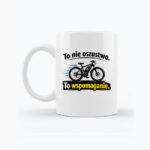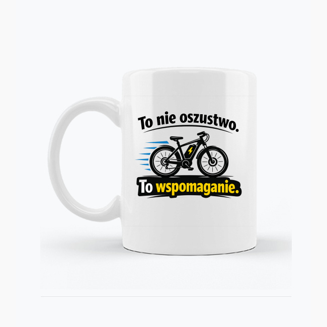 Wyraźny nadruk z motywem roweru elektrycznego i hasłem „To nie oszustwo. To wspomaganie.” został przygotowany na przezroczystym tle, dzięki czemu świetnie prezentuje się na białym kubku i zachowuje estetyczny, nowoczesny wygląd.