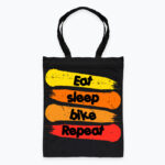 Bawełniana torba z nadrukiem Eat Sleep Bike Repeat to prosty, czytelny manifest codzienności każdego rowerzysty. Surowa typografia i kontrastowe kolory nadają torbie charakter i luz, idealny do miejskiego stylu.