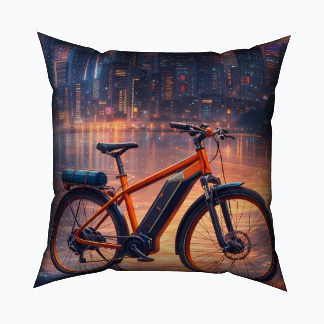 Kwadratowa, wodoodporna poduszka dekoracyjna z pełnym nadrukiem przedstawiającym nowoczesny rower elektryczny na tle nocnej panoramy miasta. Oświetlone wieżowce odbijające się w tafli wody, kontrastujące z dynamiczną sylwetką roweru, tworzą futurystyczną, miejską kompozycję inspirowaną nowoczesną mobilnością i stylem urban lifestyle.