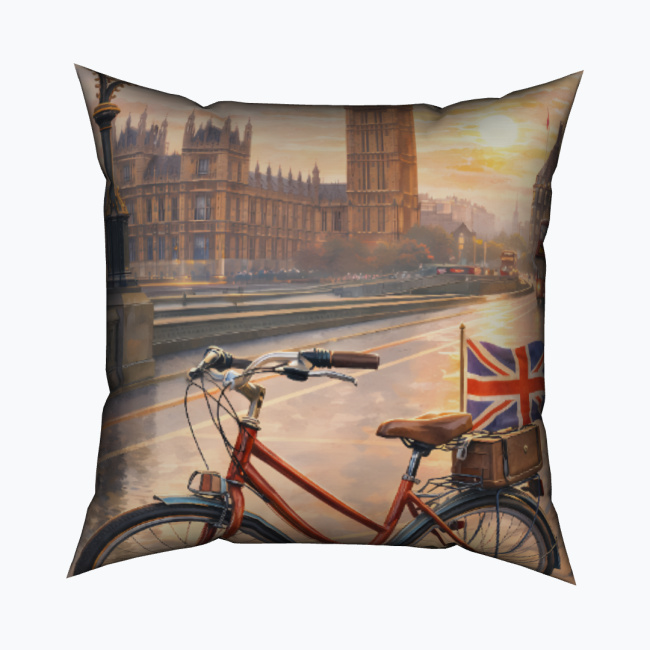 Kwadratowa, wodoodporna poduszka dekoracyjna z pełnym nadrukiem przedstawiającym klasyczny rower ustawiony na tle londyńskiego Westminsteru. W tle widoczny jest Big Ben oraz zabudowa Pałacu Westminsterskiego, a na bagażniku roweru umieszczona jest flaga Wielkiej Brytanii, podkreślająca brytyjski, miejski klimat. Całość utrzymana jest w ciepłej, malarskiej stylistyce, przywołującej atmosferę spaceru nad Tamizą o poranku lub podczas zachodu słońca.